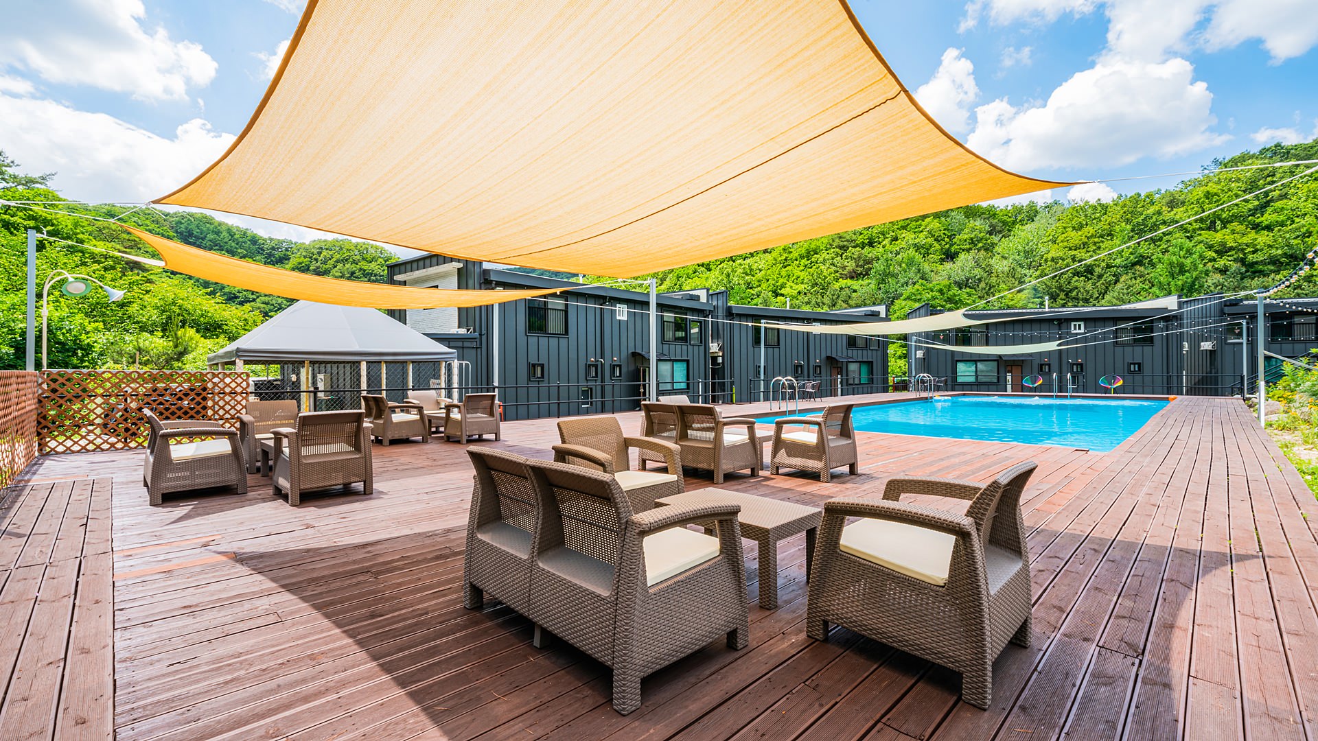펜션 가운데에 야외수영장이 준비되어 있습니다.